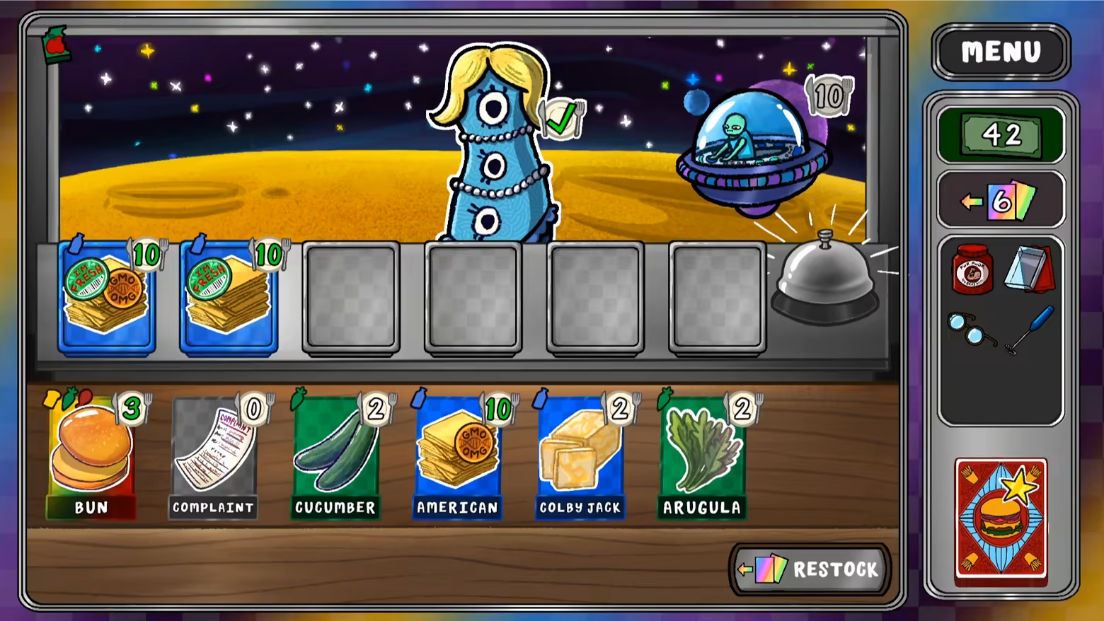 But it won't be enough to just make a really big burger. Zany bosses bring self-contained puzzles to navigate, testing your deck's flexibility. They'll slip you a card and refuse to leave until you serve it to them or clog the window with half-eaten scrap. You'd better be able to improvise.