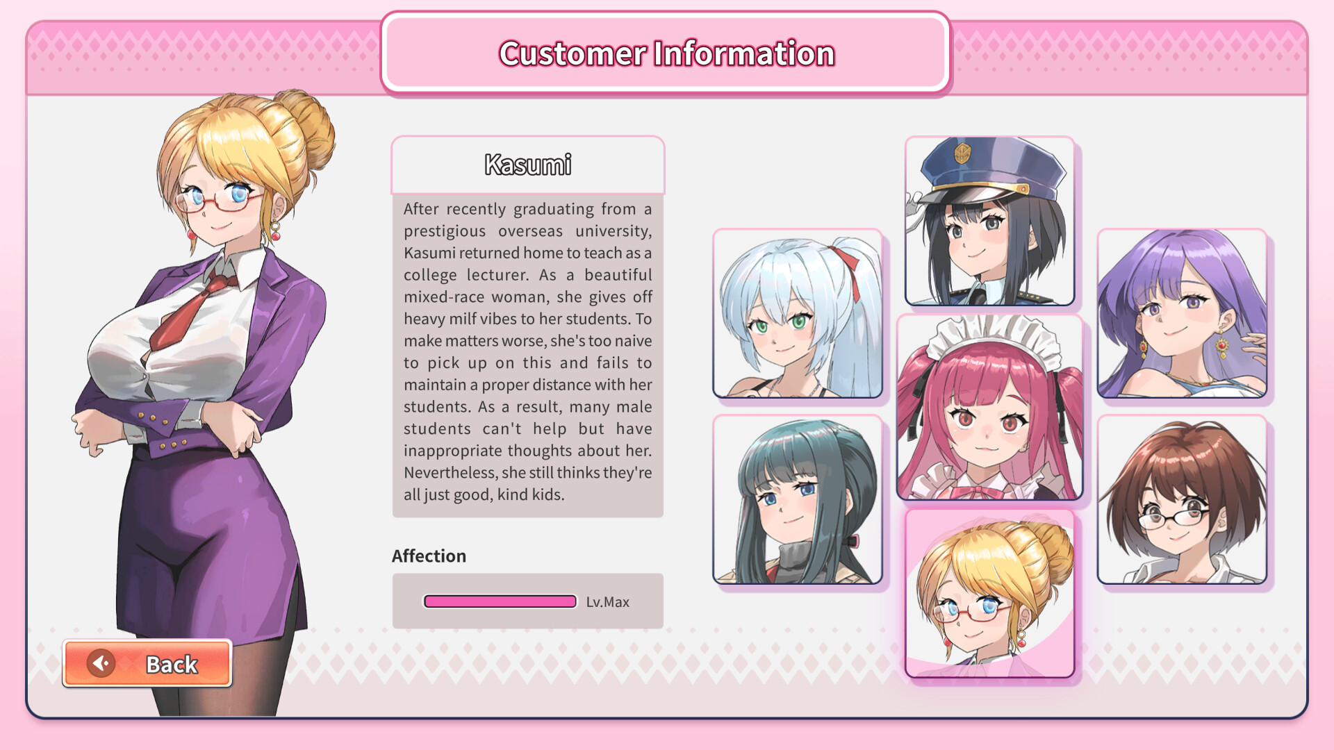 A sex worker with a stunning figure and striking curves, always dressed in fashionable and eye catching outfits. She is cheerful, gentle, and excels at social interaction. Her irresistible charm easily disarms others, allowing her to quickly sense what her clients need and deliver the experiences they crave. Despite her profession, she has a kind heart and often helps those in need behind the scenes.