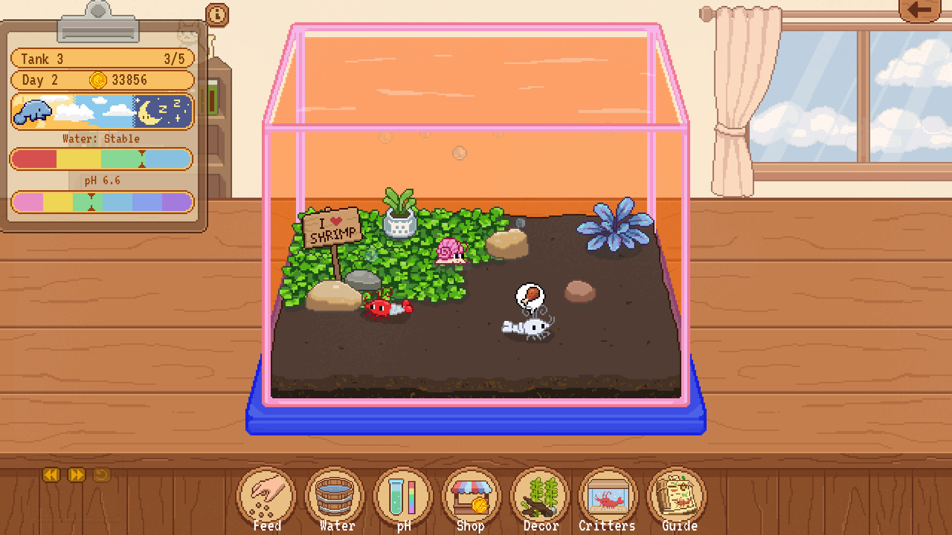 Tiny Glass Tank: Dwarf Shrimp and Friends is a cozy pixel-art aquarium game about catching colorful shrimp and snails, raising the ones you like, selling extras, and using your earnings to decorate small tanks by hand.