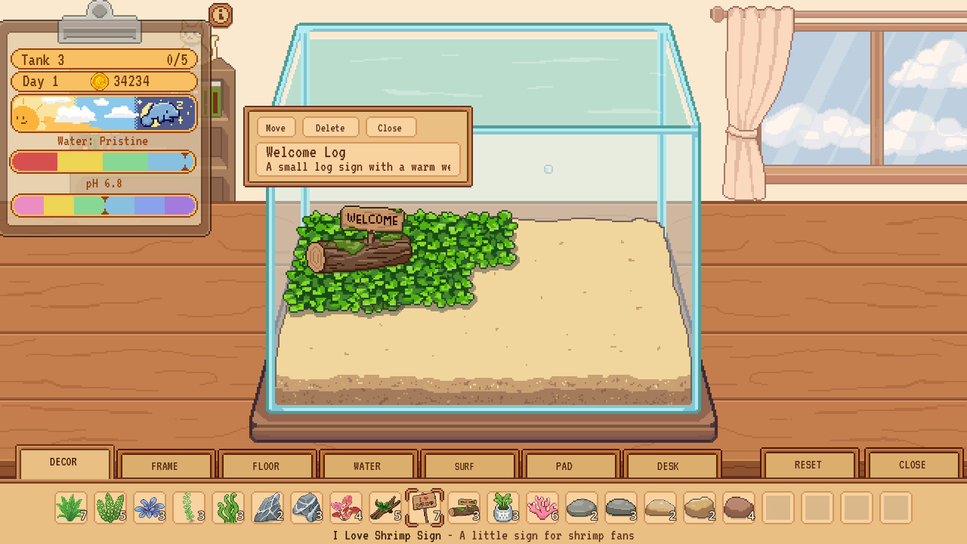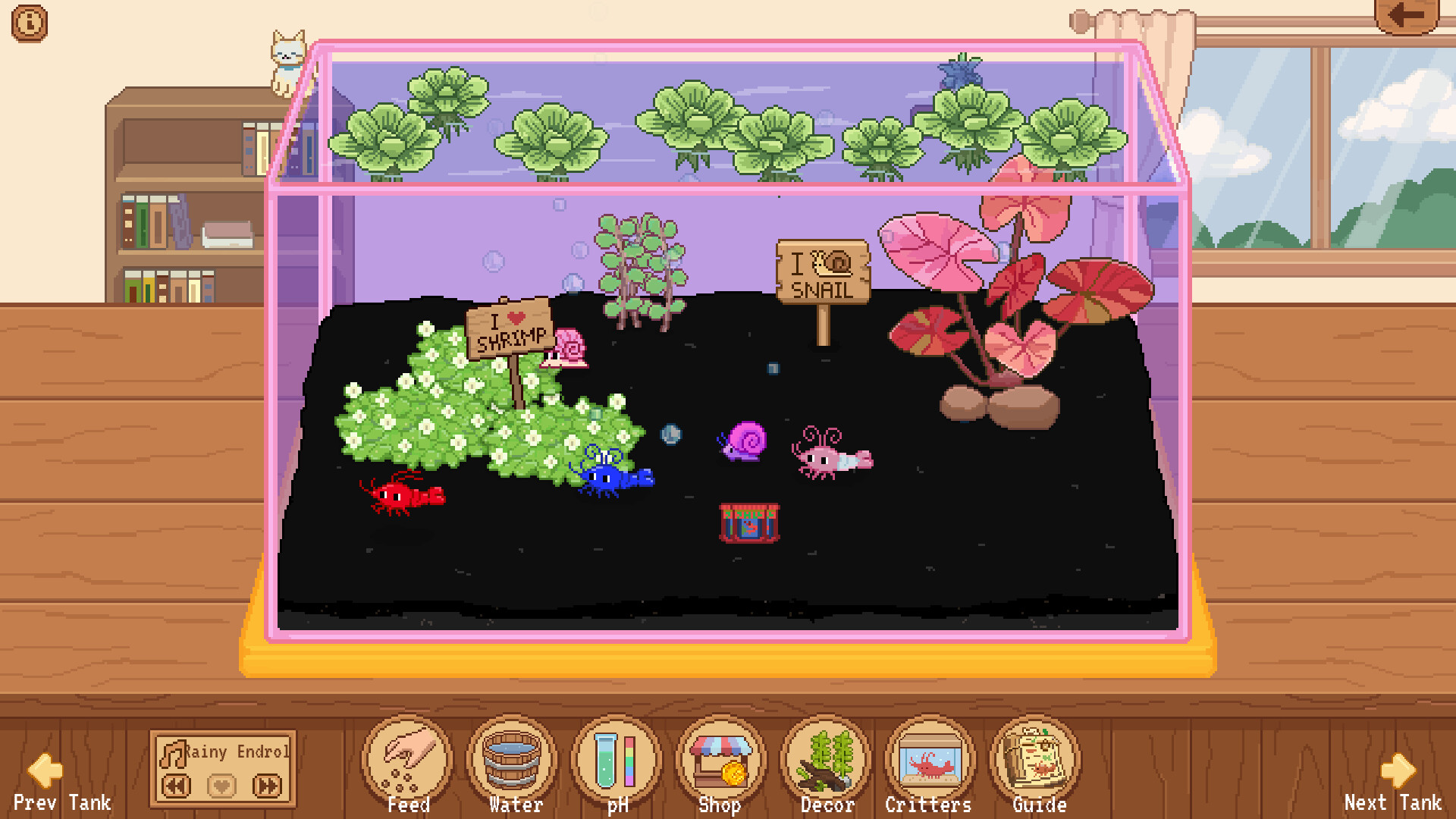 Decorating is a major part of the game. Mix plants, moss, driftwood, stones, floor styles, water looks, and tank parts to create clean little displays, lush planted tanks, or messy aquariums full of tiny creatures. Your tanks can be for display, profit, collecting, or just because they look nice.